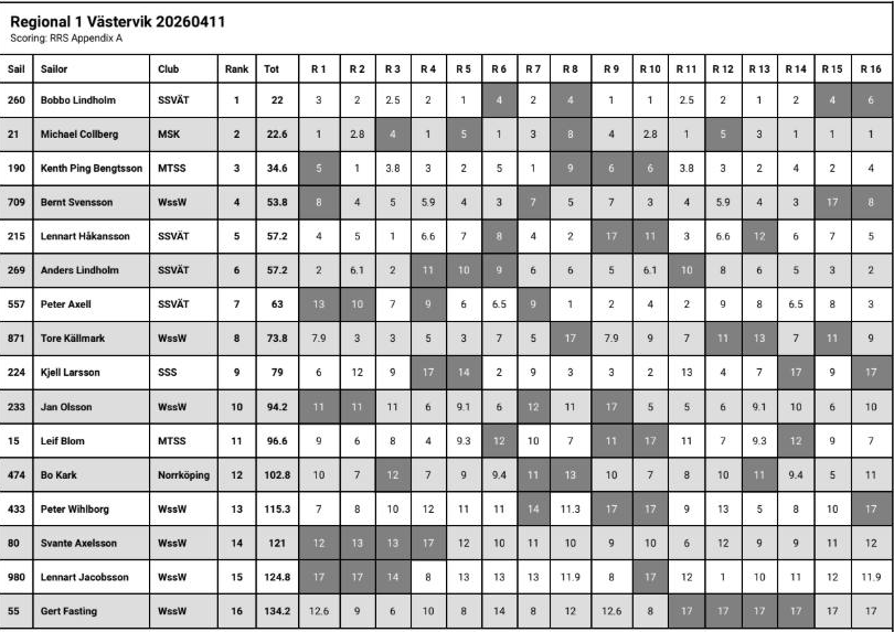 DF65 Västcupen Vår – Slutresultat